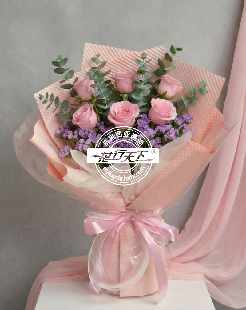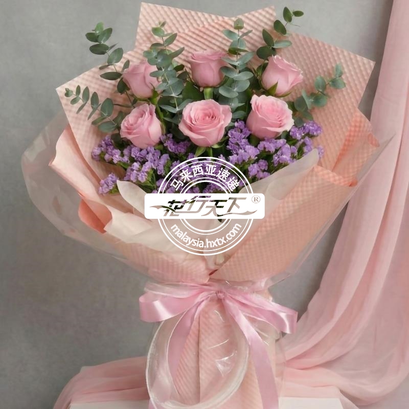 描述: 粉玫瑰6枝、勿忘我和尤加利组成、精美包装。