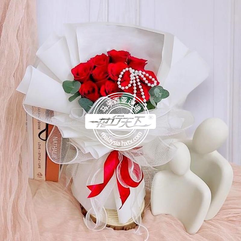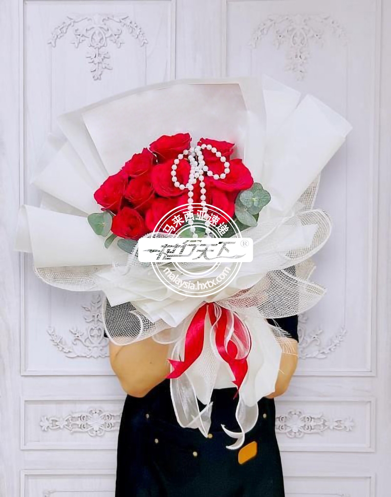 描述: 红玫瑰10枝、1条珍珠丝带和尤加利组成、精美包装。