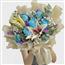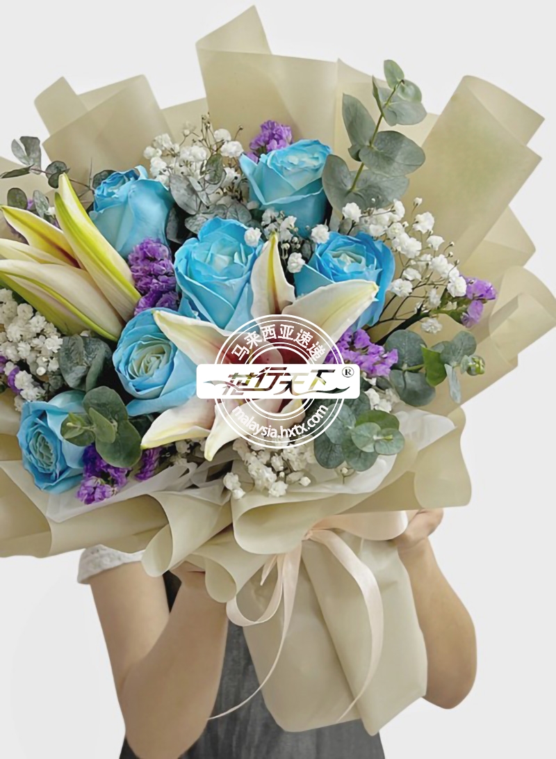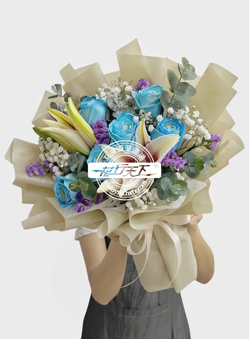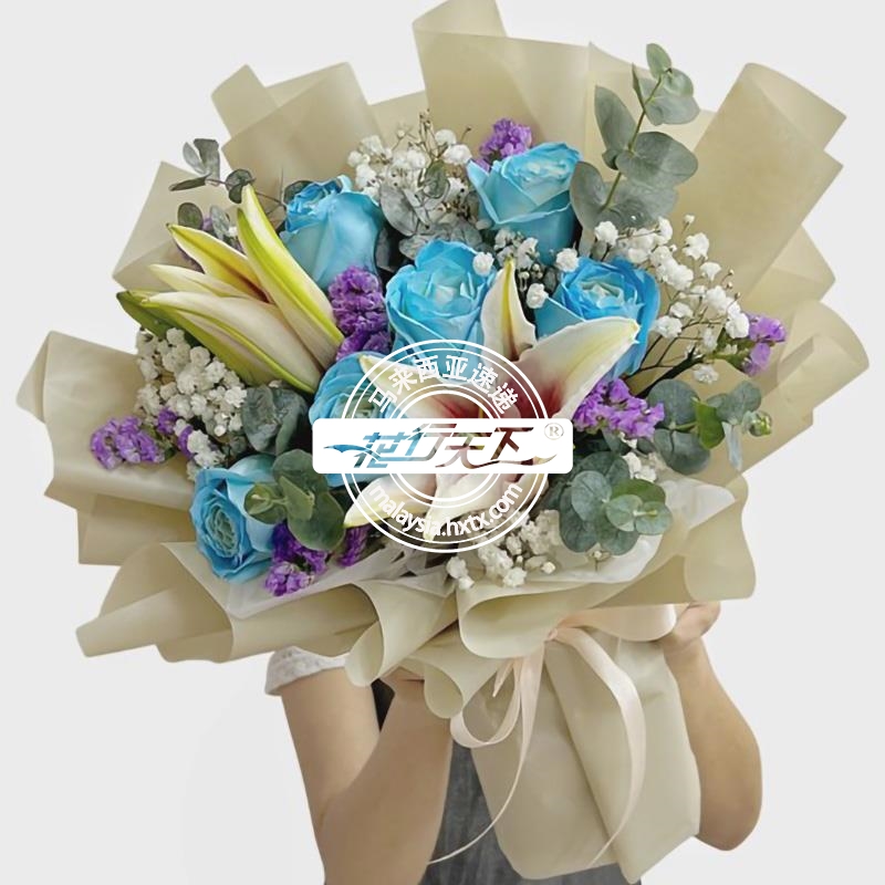描述: 蓝玫瑰6枝、单枝百合3枝、满天星,勿忘我,尤加利叶组成、精美包装。