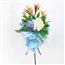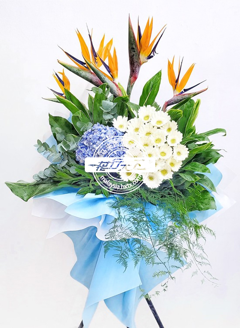 描述: 20支非洲菊,5支天堂鸟,1支绣球花和叶子组成、一层吊唁花架。