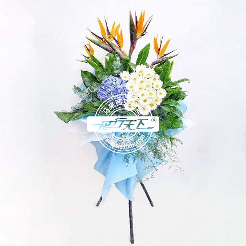 20支非洲菊,5支天堂鸟,1支绣球花和叶子组成、一层吊唁花架.
