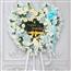 描述: 10枝玫瑰、10枝洋桔梗(每枝 20-30 朵花)、2枝绣球花、1个慰问牌、丝带、满天星、尤加利叶组成、单层花环架(高:1.5m)。