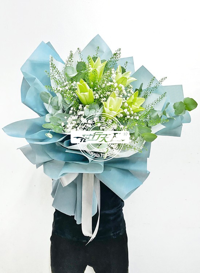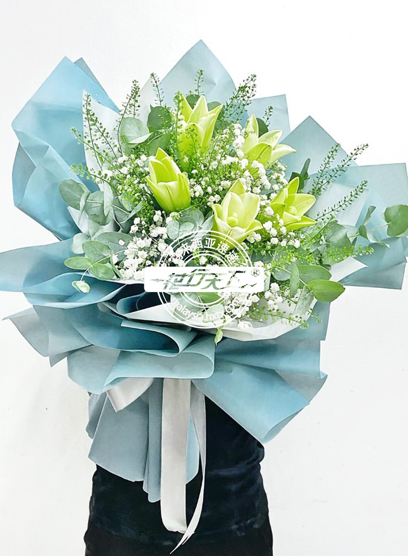 5支圣母百合、满天星、桉树叶组成、精美包装.