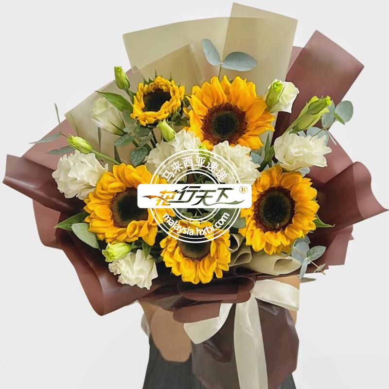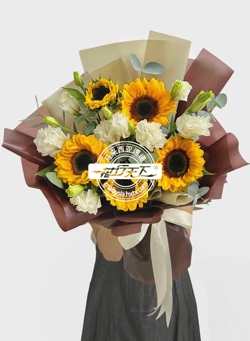 描述: 5株向日葵,2株洋桔梗(每株4-6朵花),桉树叶组成、精美包装。
